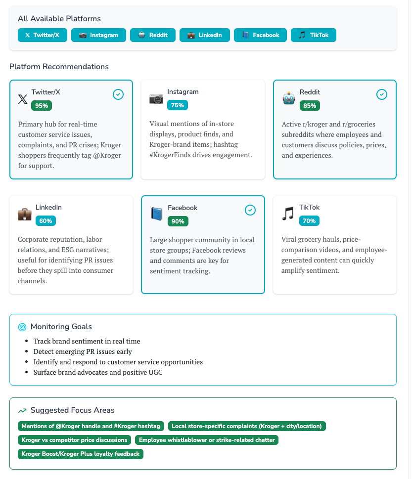 Based on your objectives, Socialhose recommends which platforms to monitor. Each platform has its own characteristics. Twitter/X is excellent for real-time conversations and breaking news - people often turn there first when they have something to say about a brand. Instagram captures visual mentions and lifestyle content, particularly valuable for consumer brands. Reddit provides deep, authentic discussions in niche communities where people speak candidly about products and services. LinkedIn is essential for B2B companies monitoring professional conversations. Facebook captures community group discussions and page comments.