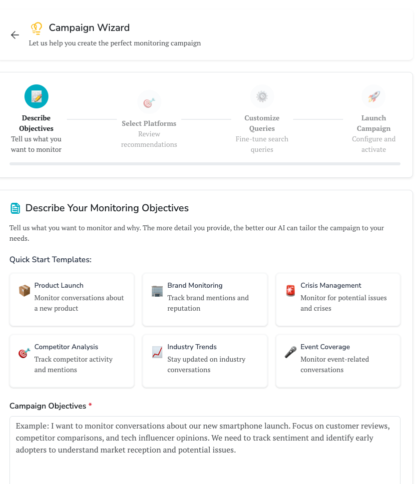 Good objectives often include the brand or product names you're tracking, the type of insights you're looking for (customer feedback, competitive intelligence, campaign measurement), and any specific concerns like crisis detection or influencer identification.