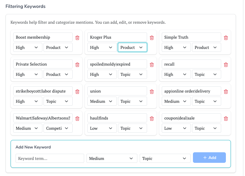 Keywords determine what content gets captured. This is the most important configuration step because it directly affects the quality and relevance of your results. Start with obvious terms like your brand name, but think beyond the basics. Include common misspellings (people often mistype brand names), product nicknames that customers use, relevant hashtags, and key executive names if you're monitoring thought leadership.