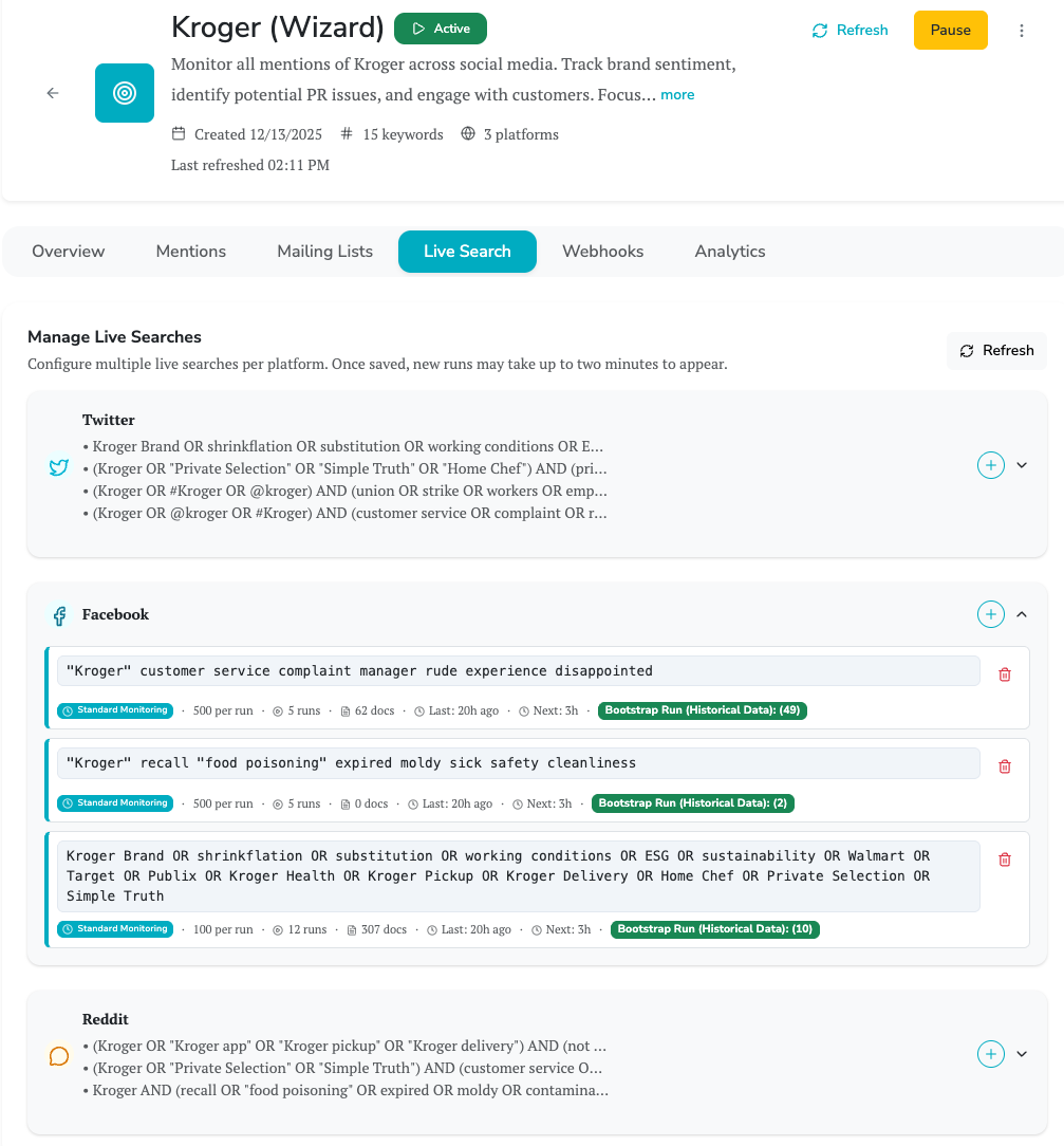 Second, Live Searches run on a schedule (daily by default) to capture new mentions going forward. These searches continue running as long as your campaign is active, ensuring you never miss relevant conversations. You can monitor Live Search status in your campaign's "Manage Live Searches" tab, where you'll see last run times, next scheduled runs, and document counts.