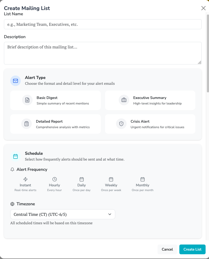 Start with a descriptive name that clearly indicates the list's purpose. "Daily PR Alerts" is better than "Alert List 1." Good names help you manage multiple lists and help recipients understand why they're receiving these emails.