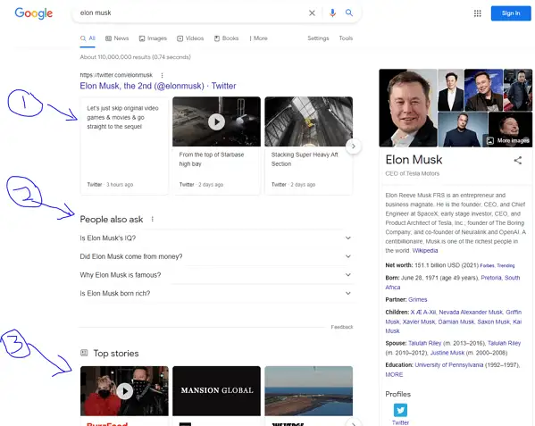In the above example, we see Elon Musk's (1) tweets show up first, followed by (2) “People also ask” and then finally (3) Top stories from the news. At times when there aren't more recent tweets from Mr. Musk, a rarity, you will find the News section being the first.