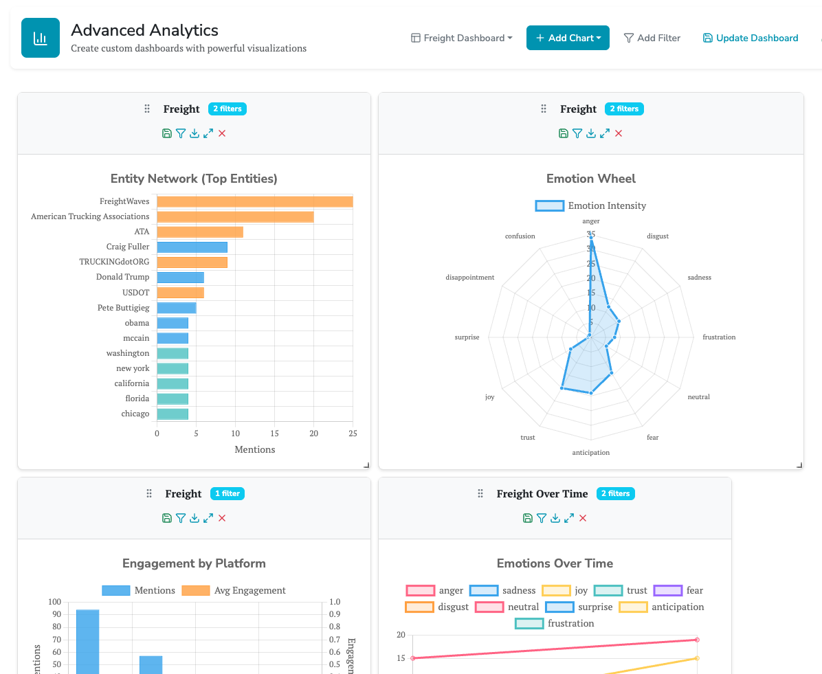 Dashboards like the one shown below make that shift visible in real time. The Entity Network highlights who the market is talking about, while the Emotion Wheel exposes the mood beneath the mentions; a spike in frustration and anger that wouldn’t surface through volume metrics alone.