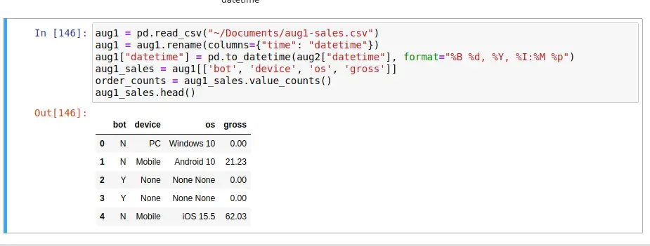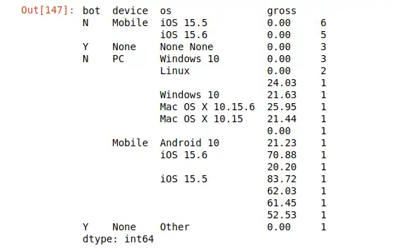 Now we have some data showing the gross sales amounts. Here we created a new DataFrame that only has the columns: bot, device, os, gross. This is not necessary, but it makes it easier for us to know what we're working with.