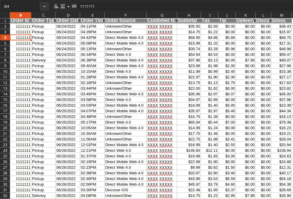 I've removed sensitive data like order id's and customer names, but this is an actual export from ChowNow's transactions. The only variables that we can use in our sales attribution are the time and order source. Neither of those variables are perfect, so we will have to still perform some approximations.